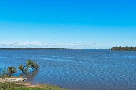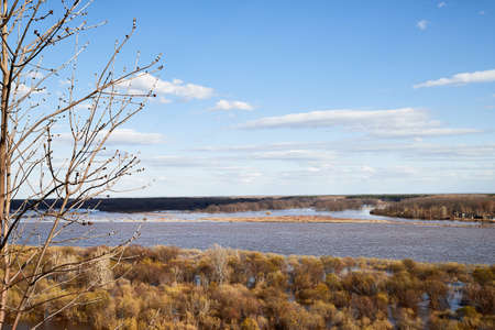 High water on a river or on a lake in sunny spring day. Russian nature landscape with water, trees and blue sky with white clouds