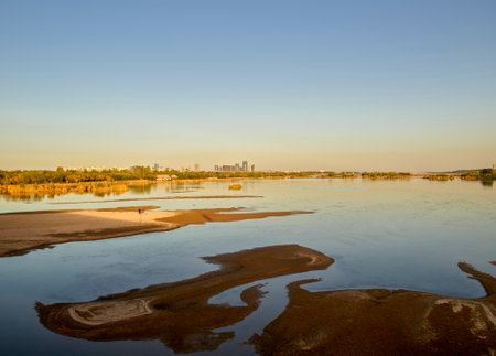 Dnipro river with trees on the banks. Landscape with wide Dnieper river on a sunny day