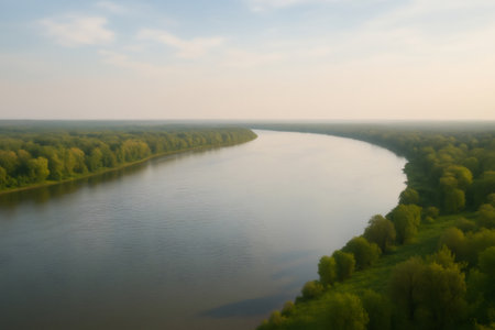 A wide river with brown water flowing through green fields, seen from above. The sky is blue, and the trees on both sides of the bank create an endless horizon. A drone captures the scene in high resolution, providing detailed and immersive footage for documentary or nature-inspired projects. --chaos 30 --ar 3:2 --quality 2 --stylize 250 --v 6.1 Job ID: b58acbf7-0c00-442e-9d11-422dbad365e3
