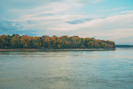 Colorful woodland along the Danube riverbank on an overcast autumn afternoon, calm and moody landscape. Selective focus.
