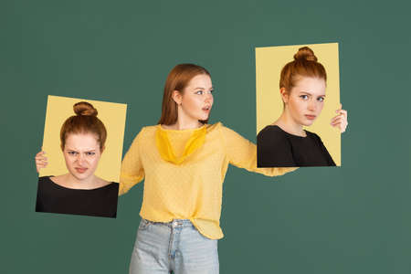Contented and depressed. Fun and creative combination of portraits of young girl with different emotions, various facial expression on splited studio background. Bipolar personality. Copyspace for ad.