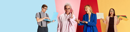 Set of different young people, men and women, employees, students studying and working against multicolored background. Business, education, emotions