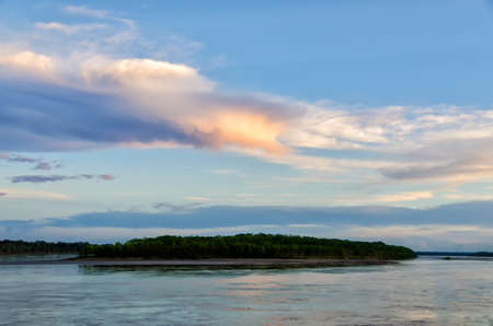 Sunset over the river in summer. Beautiful landscape with river and trees.