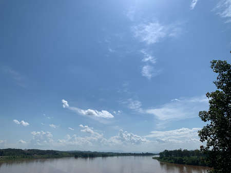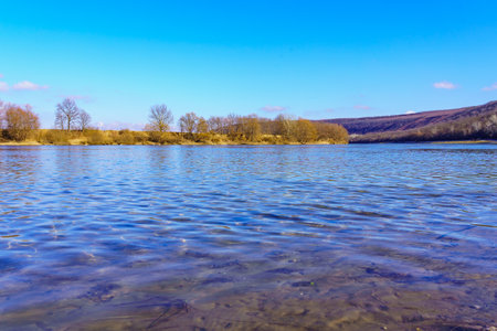 beautiful spring landscape, view of river and forest on bright sunny day, white clouds in blue sky, sunlight and shadows, river banks and water stream