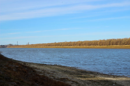 Beautiful view of the river bank calm winter wildlife. Background with copy space for text