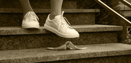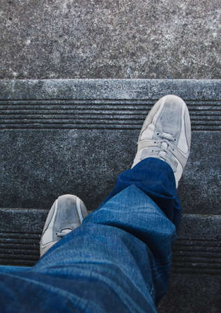 An unrecognizable Latino man with a jean and white sneakers going down a cement stairs. Horizontal orientation.