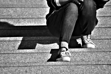 These are the -trousered- legs of a girl sitting on the steps of a square