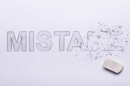 Close-up Of Pencil Eraser Erasing Mistake Word On White Paper
