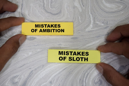 Concept of Mistakes of ambition and mistakes of sloth write on sticky notes isolated on Wooden Table.