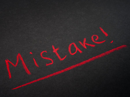 Word MISTAKE, written on a sticker that lies on documents and a wooden table.