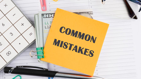 Conceptual symbol. Common mistakes text written on a yellow sticker next to American hundred dollar bills, a calculator, a pen on a white background
