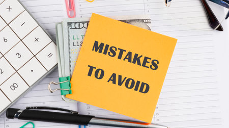 MISTAKES TO AVOID, text on a yellow sticker on American banknotes on the background of a business notebook