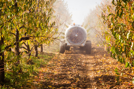 Agricultural atomizer spraying pesticides on apple fruits