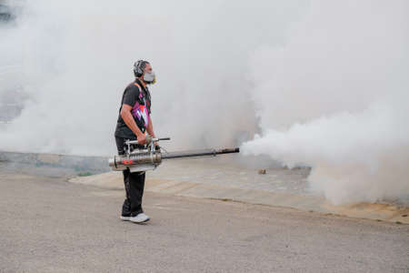 Man work fogging to eliminate mosquito for preventing spread dengue fever and zika virus