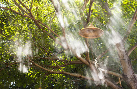 Humidification of air by steam on the street outdoor in a hot summer day morning