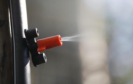 Sprinkler head from a high pressure outdoor cooling system for cafe, close-up, copy space.
