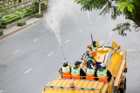 Bangkok Thailand : February 16, 2019 : Municipal officials inject high pressure water into the air on the truck to help reduce the amount of dust pm2.5, Bang Rak District