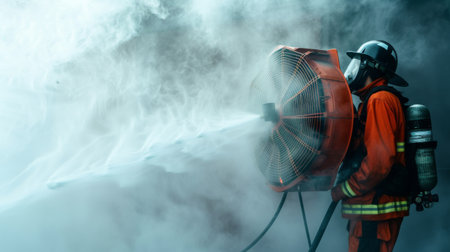 A vintage industrial fan stands in a dimly lit environment, surrounded by swirling mist, creating a captivating and atmospheric scene.