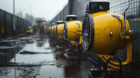 A row of yellow concrete mixers sits amidst a muddy construction site, surrounded by mist and rain, showcasing heavy-duty machinery used in industrial projects.