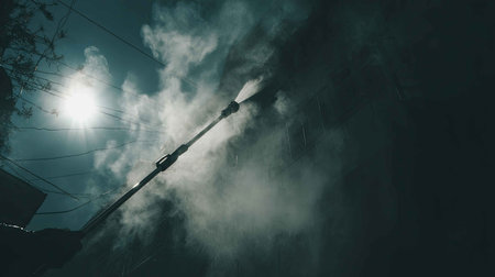 A silhouette of a power washing service worker cleaning a building under bright sunlight, releasing steam and water spray into the air, emphasizing cleanliness.