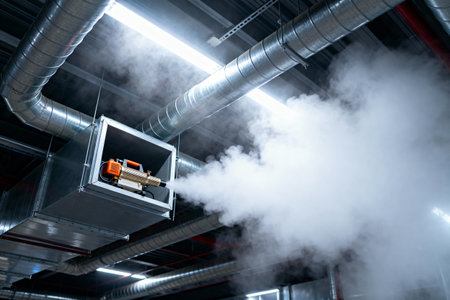 A fogging machine is used to disinfect an industrial space, ensuring a clean and safe environment