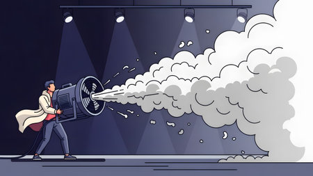 A man in a trench coat operates a large fan that expels a thick cloud of white smoke. Clear detai...