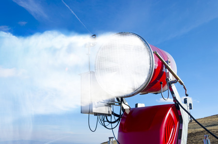 Artificial snow scatters from the muzzle of a snow cannon against the backdrop of blue sky and mountains