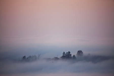 View of a beautiful misty morning on the top of the hill.