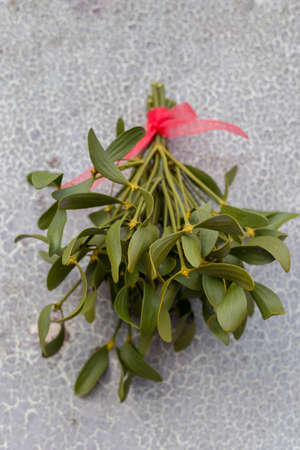 Mistletoe bunch with red bow hanging on gray wooden wall. Traditional christmas decor
