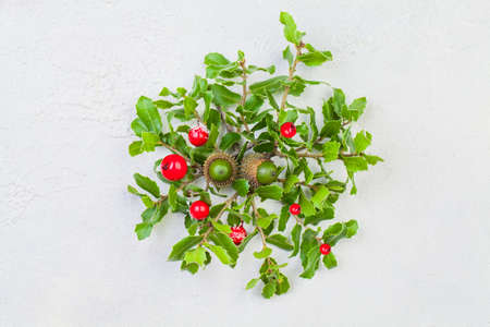 Overhead view of mistletoe bunch, sprigs of holly, and red berries tied with string. Winter botany foliage, seasonal organic plants. White wood background.