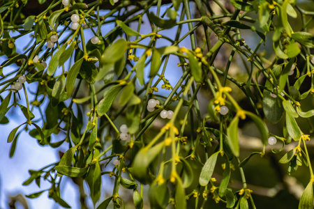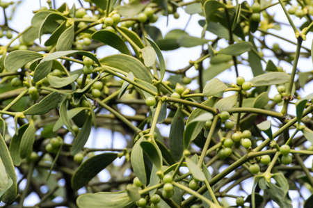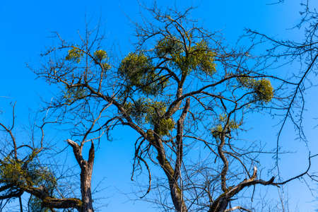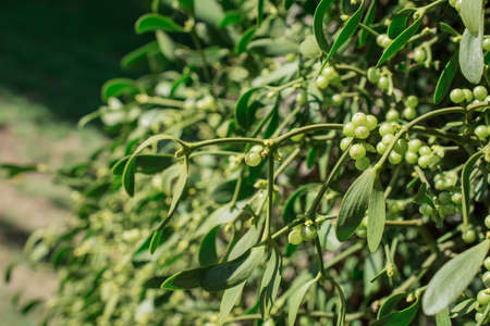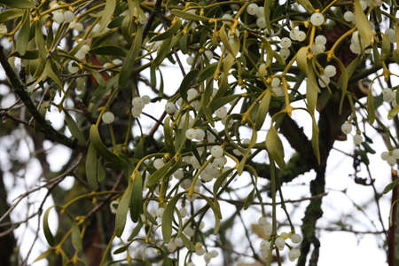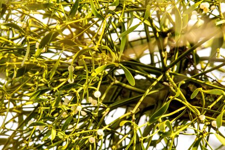 Tree attacked by mistletoe, viscum with white berries, family Santalaceae obligate hemiparasitic shrubs, evergreen parasite on native tree, plant hanging on branch, medicinal herbs, christmas symbol