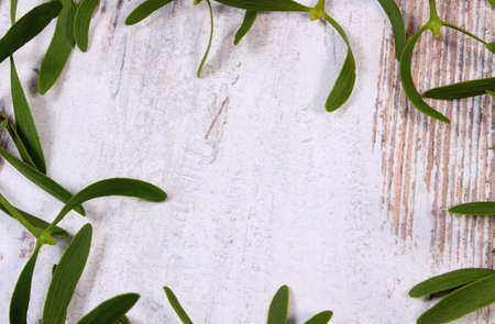 Frame of fresh green mistletoe for Christmas and copy space for text on old wooden background