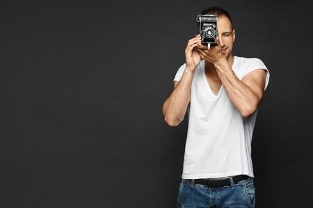 Handsome male photographer, a reporter with retro camera preparing to take a photo, isolated at the dark background