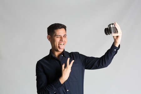 Happy young man wearing shirt posing isolated over white background taking images with dslr camera. Photographer covering his face with the camera.