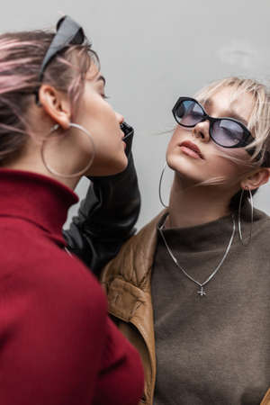 Fashionable stylish vogue portrait of beautiful young girls in a fashionable outfit with glasses, a sweater and a leather jacket in the city. Urban women's clothing style