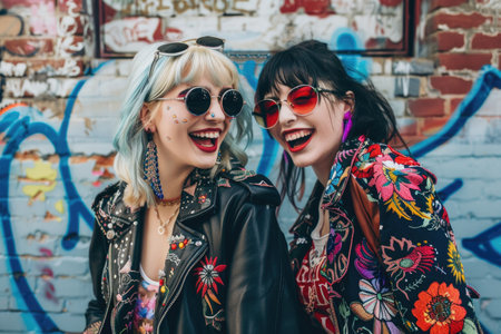 Two friends laugh together in front of a brightly colored graffiti wall.