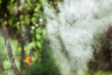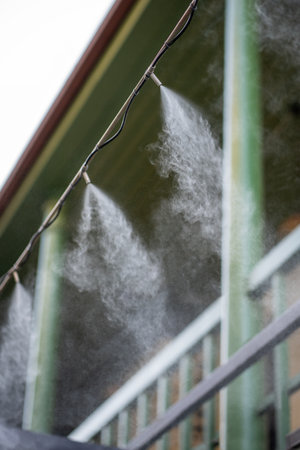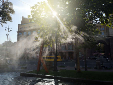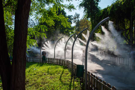 Humidification of air by steam on the street outdoor in a hot summer day morning