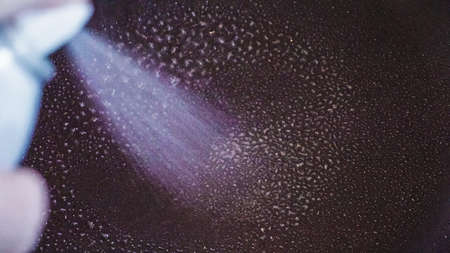 Hand of anonymous person using gloves and a water bottle sprayer against black background.