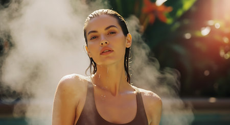A serene woman relaxing in a steamy outdoor setting after a workout