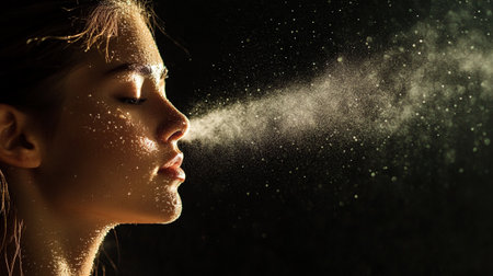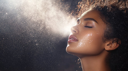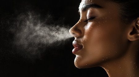 Close-up portrait of a beautiful young woman using a spray of water.