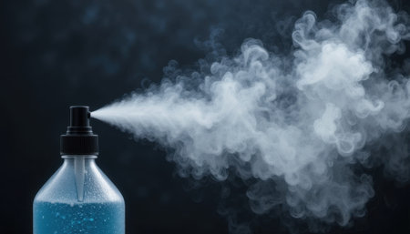 A spray bottle expels mist, revealing a blue liquid inside against a dark background showing vapor.