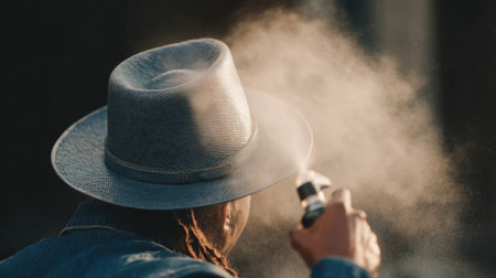 Medium shot of a person wearing a stylish leather hat while spraying it with a UV barrier emphasizing daily sun defense and ecoconscious maintenance.