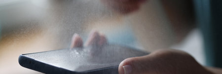 Mobile phone in hands of woman is treated with antiseptic spray close-up. Disinfection of smartphone with antiseptic concept.