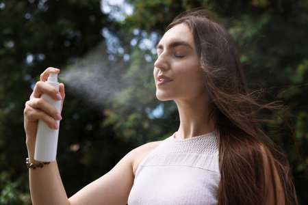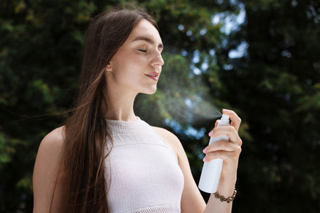 Smiling woman spraying thermal water onto her face outdoors