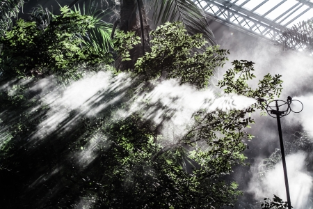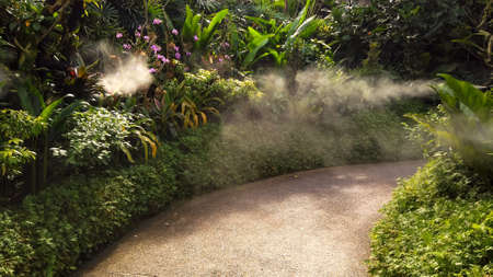 Sprayed water droplets as steam over walkway surrounded by tropical trees and bushes under bright summer sunlight in forest. National recreation park with rare flora and foggy sidewalks on sunny day