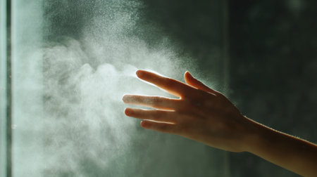 A soft hand reaches through a mist, creating a serene and tranquil atmosphere. This image captures a delicate moment of beauty and light.