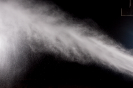 A stream of water and a cloud of drops from the atomizer