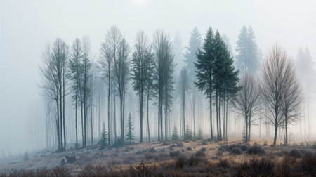 Mystical forest scene with tall trees emerging from dense fog. Minimalist composition showcases natural beauty, perfect for wellness, meditation, or environmental concepts.