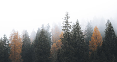 Autumn in a foggy Dolomites valley, Italy
