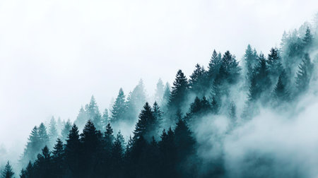 Discover a captivating misty forest landscape featuring tall evergreen trees enveloped in soft fog. This serene scene evokes tranquility and natural beauty, ideal for nature lovers.